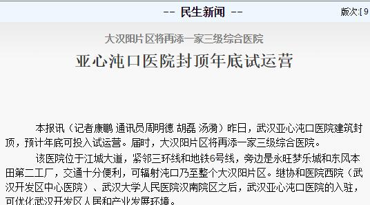 大漢陽片區(qū)將再添一家三級綜合醫(yī)院,亞心沌口醫(yī)院封頂年底試運營?。ㄝd《長江日報》2017年3月27日第九版) 鏈接:http://cjrb.cjn.cn/html/2017-03/27/content_5601713.htm?from=groupme